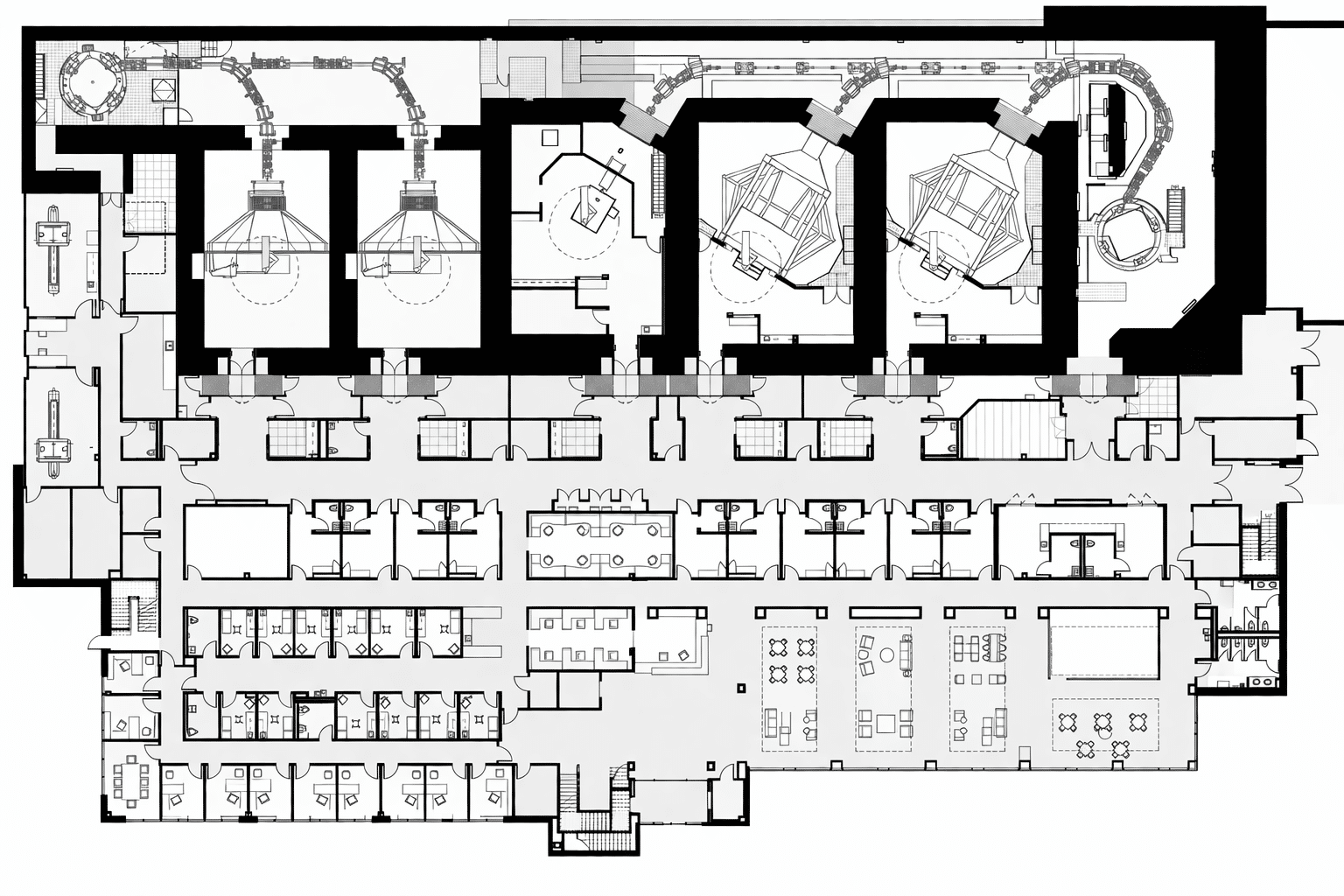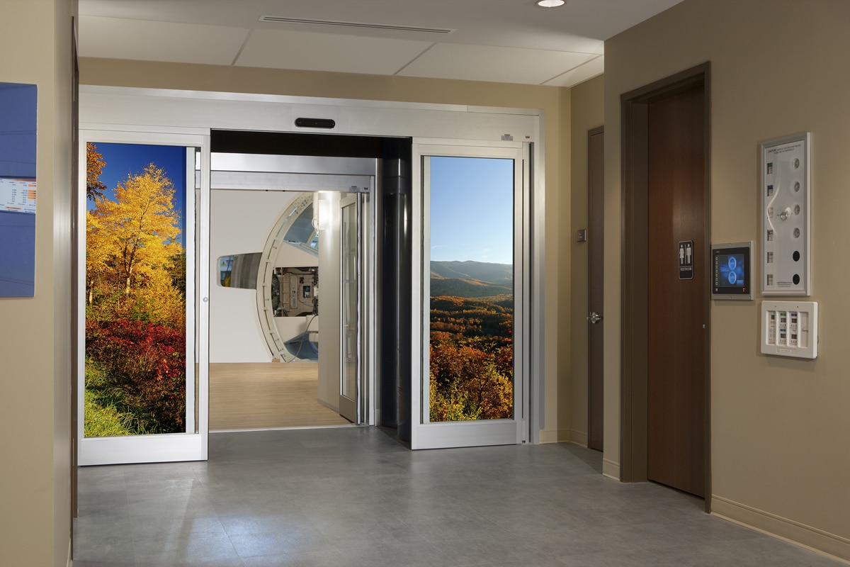 Shielded sliding doors were first used at this location in place of treatment room entry mazes. These doors saved valuable space and reduced construction costs. Today, most new proton centers analyze the benefits attributed to these sliding doors. Where sites are highly constrained, these doors provide a space-saving alternative to the traditional layout.