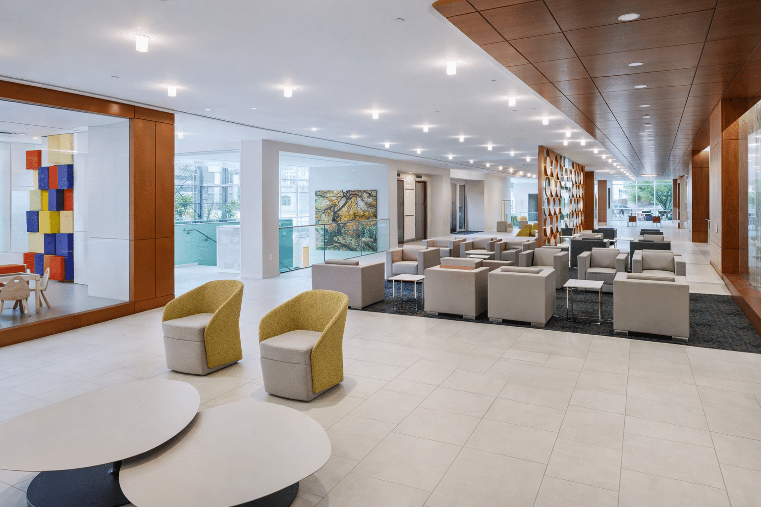 The center is a facility that facilitates healing. Beginning at the front door, visitors are invited to relax in a hotel-like space with natural sunlight and city views. The lobby features an open concept waiting area, café, outdoor patio, restrooms, and a children’s play area, all designed to make patients feel comfortable.