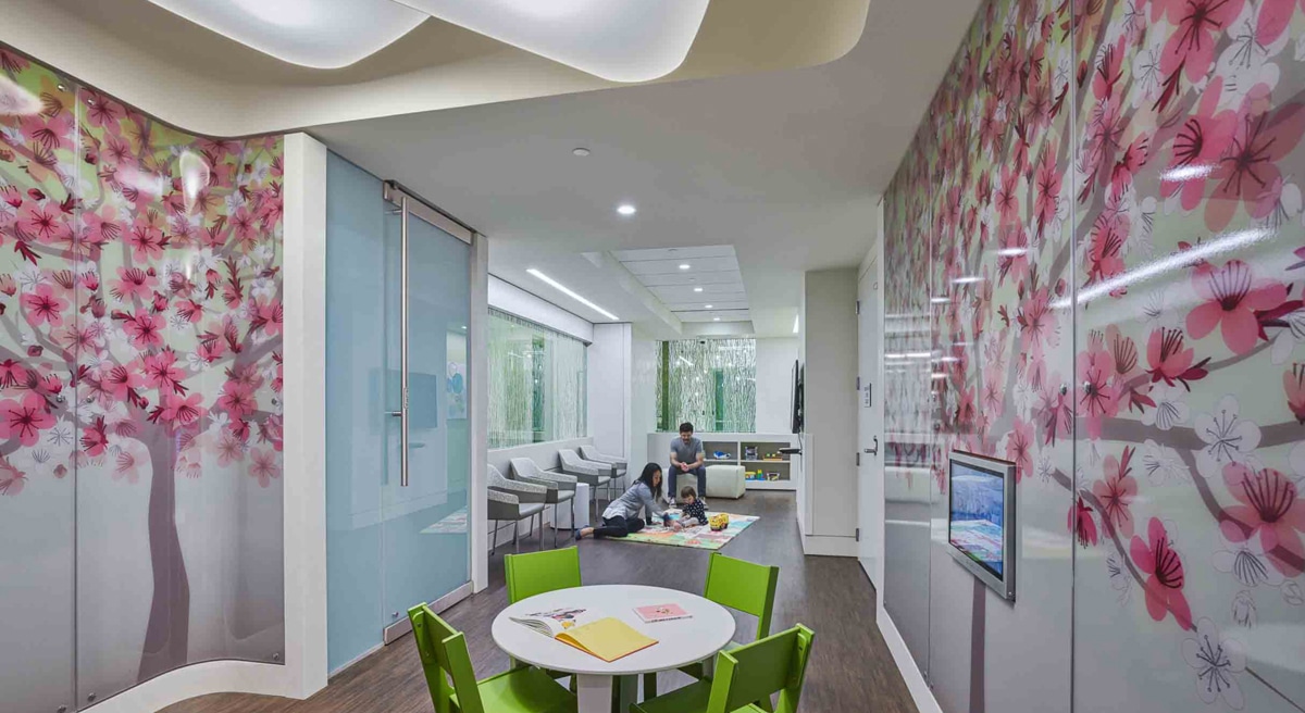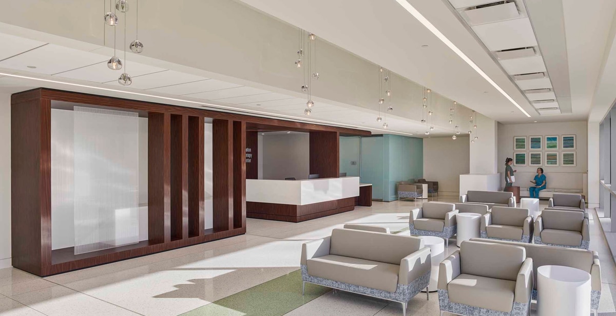 Responding to a very constrained site, the design lifted the building above ground allowing ambulance access below and connecting the proton clinic to Sibley’s radiation oncology department with a new pedestrian bridge.